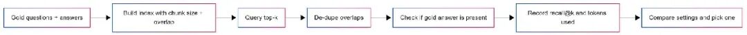 你需要三样东西:一小套有已知答案的真实问题;一个可重复的方式,用特定分块设置建索引;一个循环,逐个提问,取top k,检查正确答案是否出现,记录会发送给模型的token数。