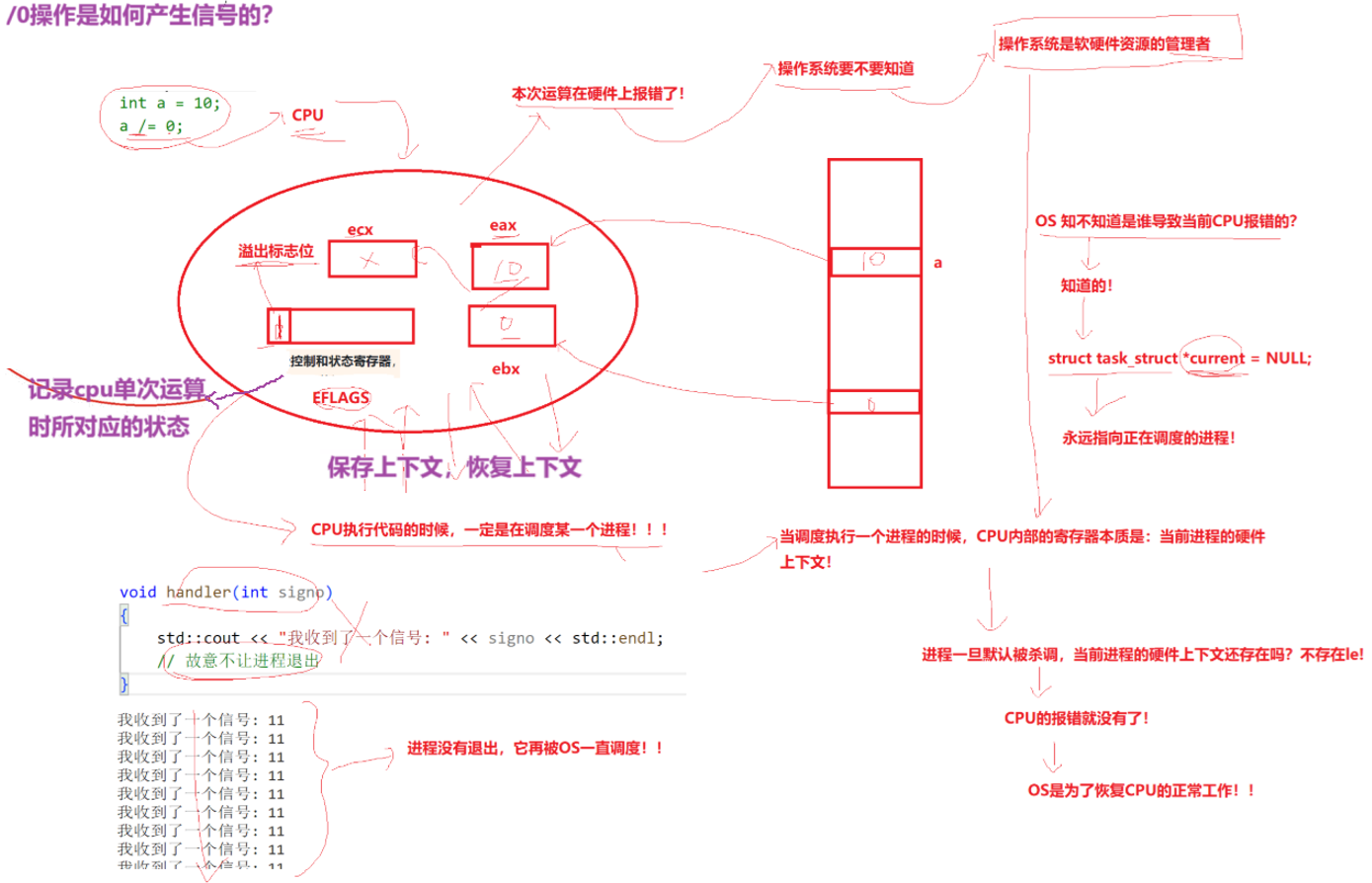 内容涵盖键盘组合键(如Ctrl+C、Ctrl+\等)产生信号、通过kill命令和函数(kill/raise/abort)发送信号、软件条件触发信号(如alarm定时器)以及硬件异常(除零错误、野指针)导致的信号产生。重点分析了信号处理机制,包括自定义信号捕捉、特殊信号(9/19号)不可屏蔽的原因,并通过代码示例演示了alarm实现定时任务调度的原理。文章还深入探讨了硬件异常与操作系统的交互机制,解