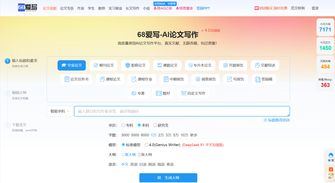 • 专注快速生成原创初稿,输入标题和专业即可产出5万字以内内容,非毕业季约20分钟完成,高峰期也仅需30分钟,重复率和AI生成率都较低;