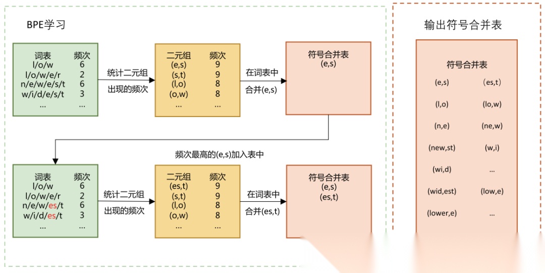 。 - 然后统计哪些相邻字符对最常见,比如 (e, s),就把它们合并成 es。