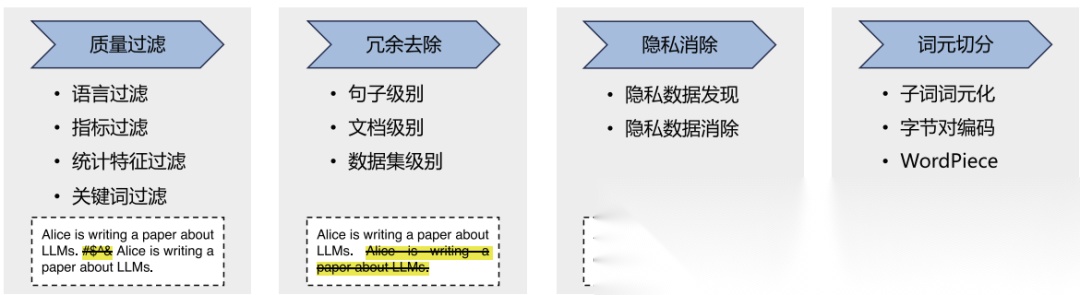 大语言模型的相关研究表明,数据质量对于模型的影响非常大。因此,在收集了各种类型的数据之后,需要对数据进行处理,去除低质量数据、重复数据、有害信息、个人隐私等内容。典型的数据处理流程如下图所示,主要包括质量过滤、冗余去除、隐私消除、词元切分这几个步骤。
