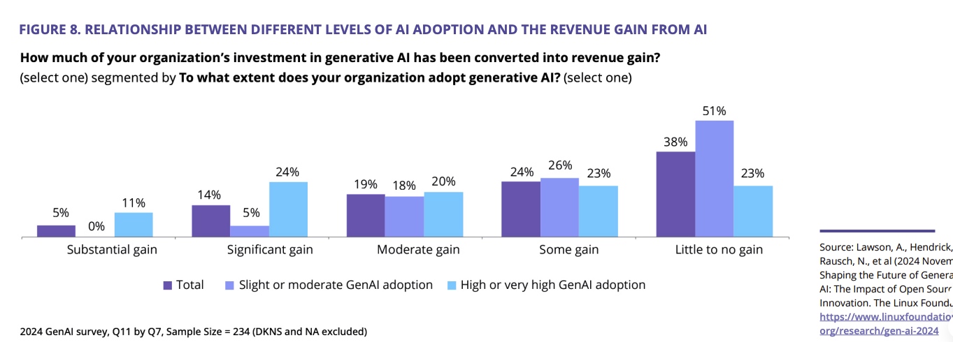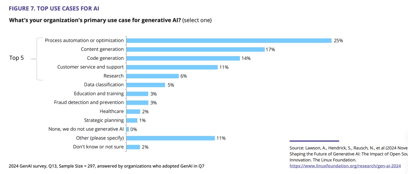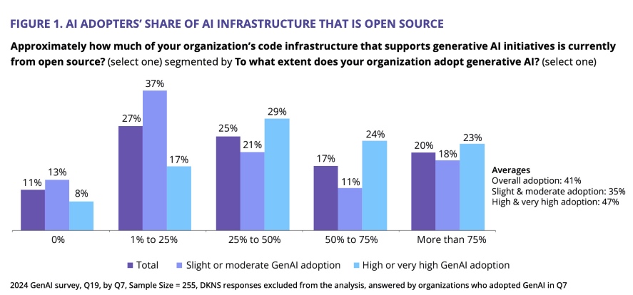 该报告显示,94% 的受访企业已经在使用 AI,其中 89% 的 AI 用户采用了某种形式的开源 AI 解决方案。