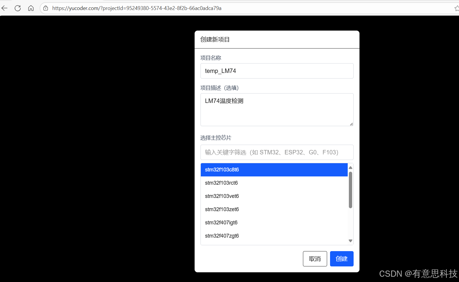 1、点击首页的新建项目,创建要开发的LM74温度检测项目,填写项目名称,项目描述,选择使用的主控芯片后,点击创建。