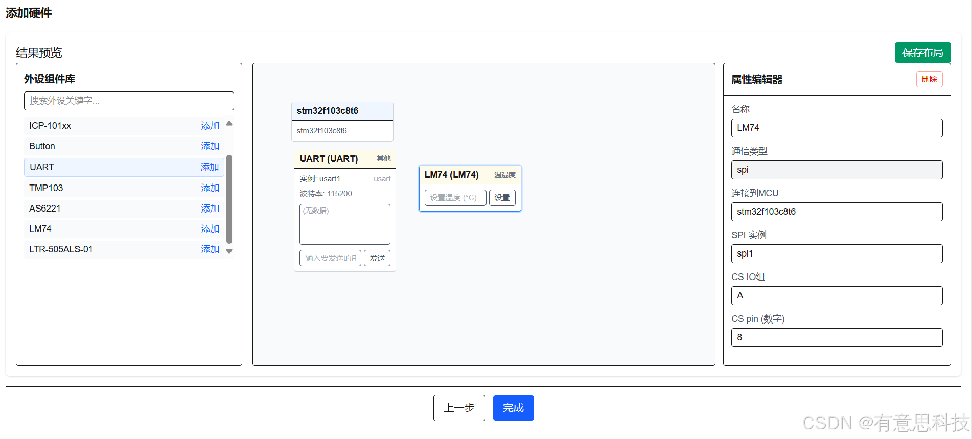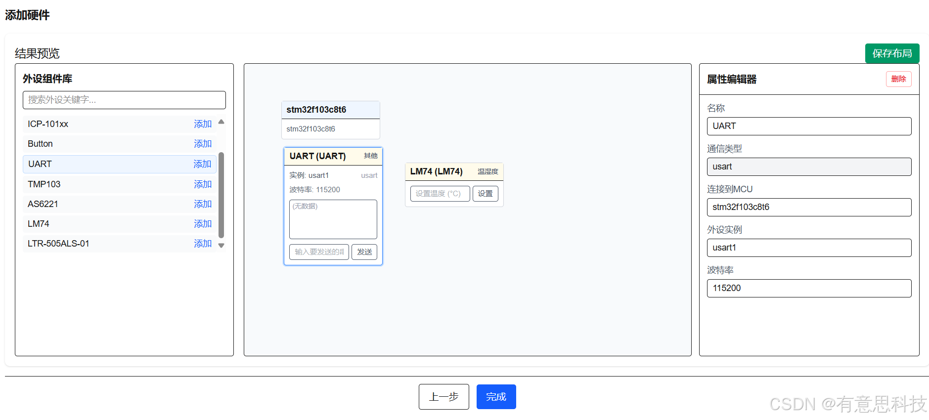 点击添加好的组件,可以编辑它的属性配置,与主控芯片的引脚连接等。