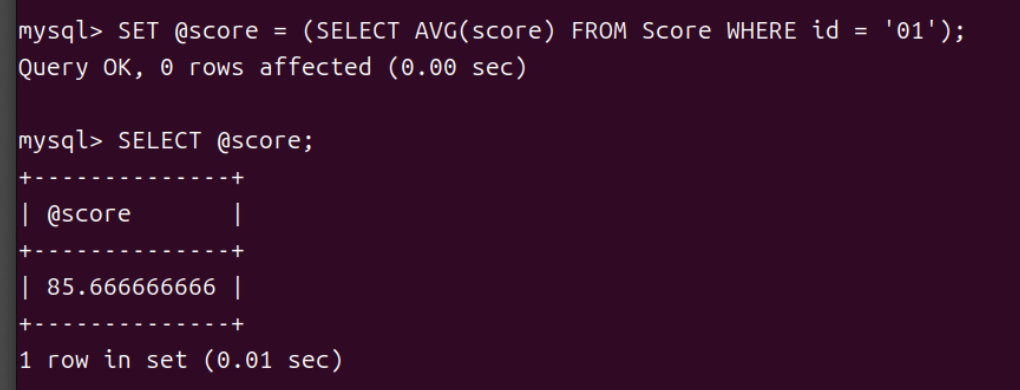 使用用户变量查询Score表中id为01的学生平均成绩: