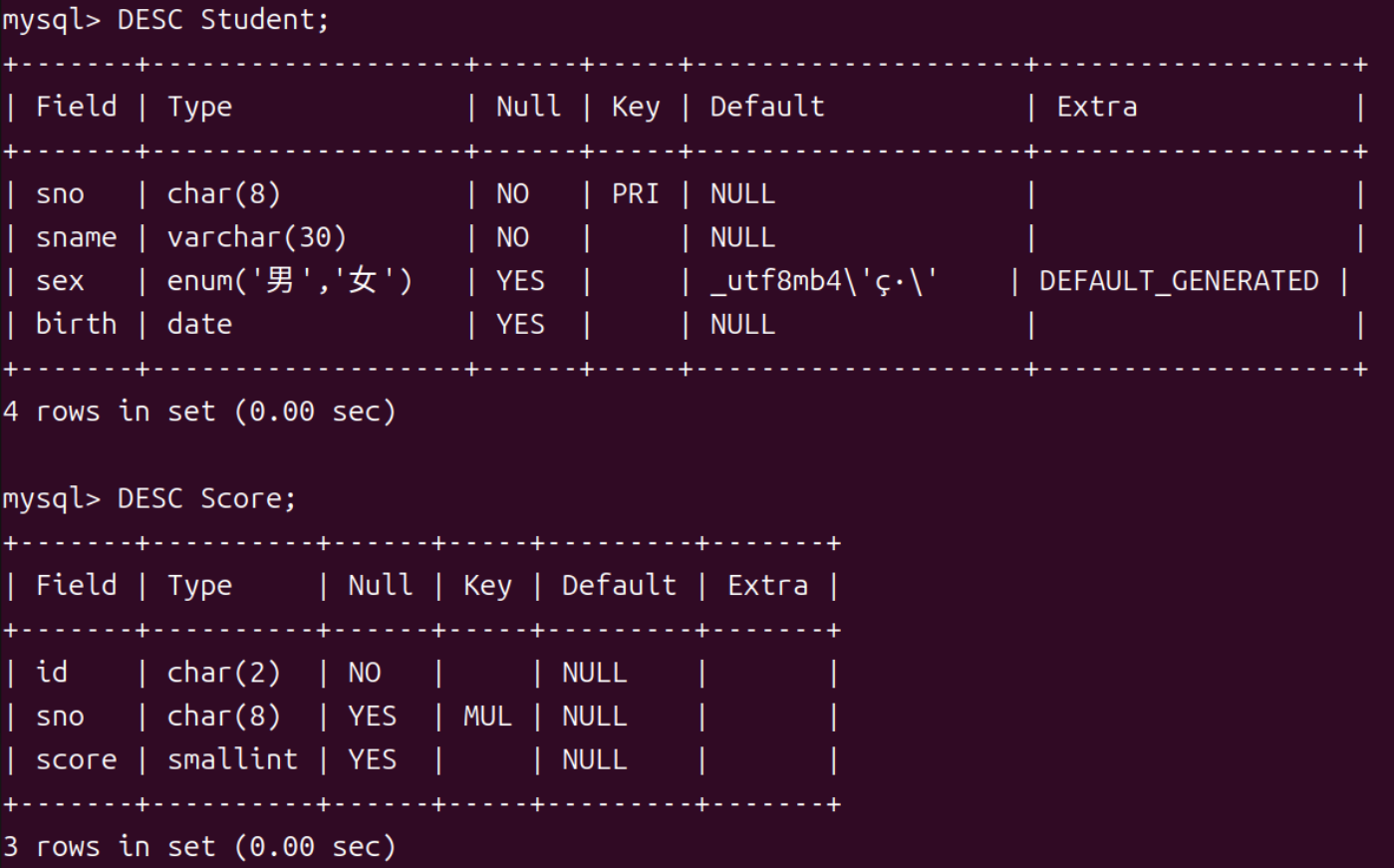 创建了一个Student的数据库进行学习,里面有两个基础表——Student和Score:常量即在程序运行过程中恒定不变的值,分为字符串常量、数值常量、日期时间常量和布尔常量等。和c++差不多,字符串就是“hello”,“He said: \"hello.\" ”,(ts:\" 为转义字符,表示冒号里的”)。数值就是整数类型和浮点数类型。日期是DATA(“年-月-日”),时间为TIME类型(“8: