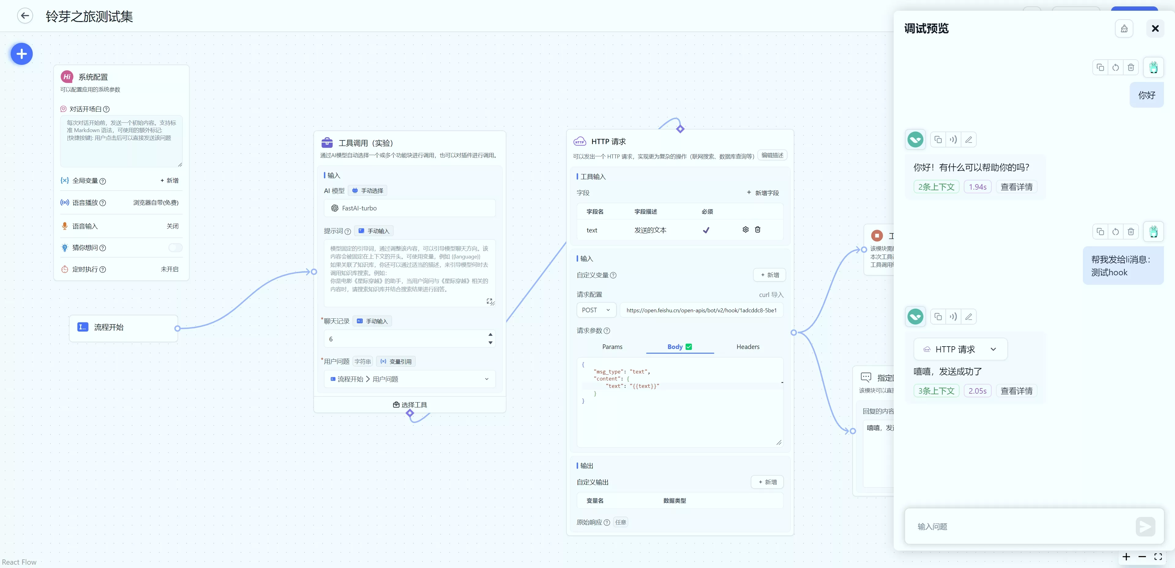 - 为工具调用挂载一个HTTP模块,功能描述写上:调用飞书webhook,发送一个通知。