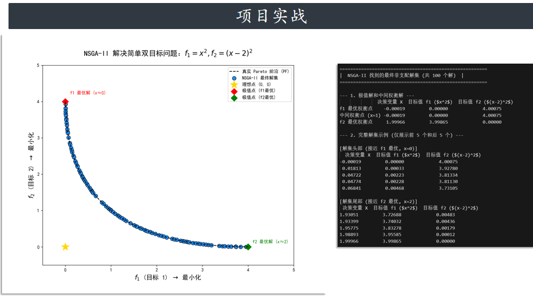 本文介绍了多目标优化问题及其核心概念,重点讲解了NSGA-II算法的原理和实现。主要内容包括: 多目标优化基础:解释了Pareto支配关系、Pareto最优解和Pareto前沿等核心概念。 NSGA-II机制:详细解析了快速非支配排序和拥挤距离计算两个核心机制,用于平衡解的收敛性和多样性。 算法流程:完整描述了NSGA-II的迭代过程,包括种群合并、非支配排序和精英选择策略。 代码实现:提供了Py
