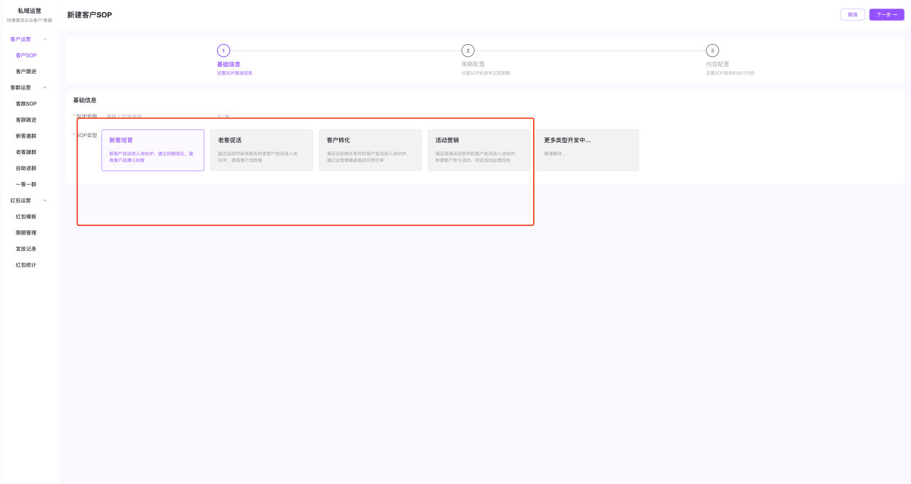 新客培育SOP:新客户添加后自动进入该SOP流程,通过系列化内容传递品牌价值,建立初期信任关系。