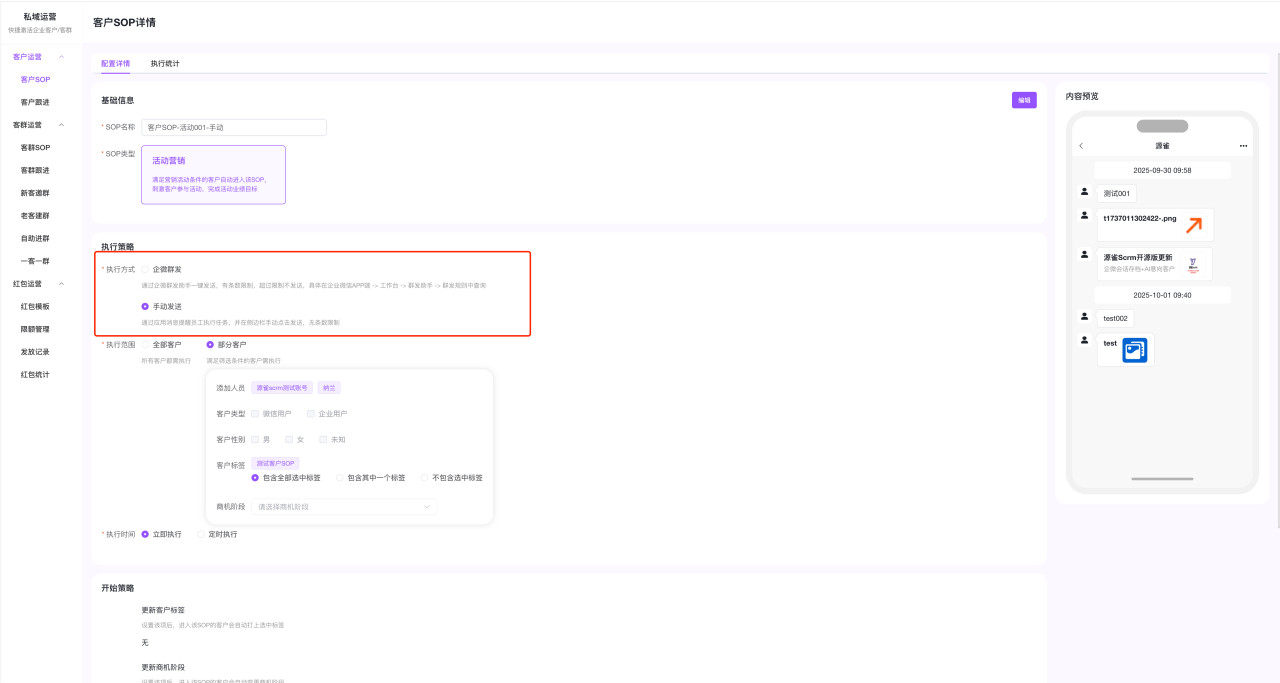 源雀SCRM全新SOP功能支持两种消息发送方式,满足不同场景下的运营需求: