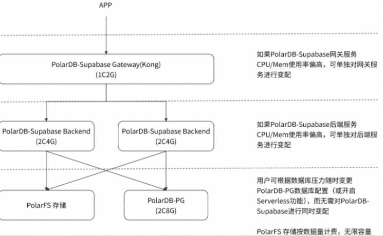 - 企业级稳定高可用:采用PolarDB-PG 和 Supabase分离部署架构,分层保障业务高可用