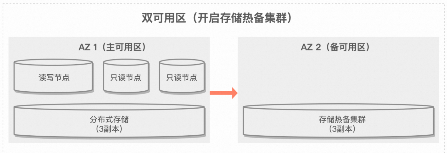 PolarDB-PG 采用计算存储分离的Share-Everything架构, 在读写节点故障时优先和同AZ的只读节点进行切换。由于读写节点和只读节点共享同一份数据,所以切换能保证数据不丢失(RPO=0)。同时采用在备可用区部署存储热备集群的方式来达到跨AZ数据容灾的能力。
