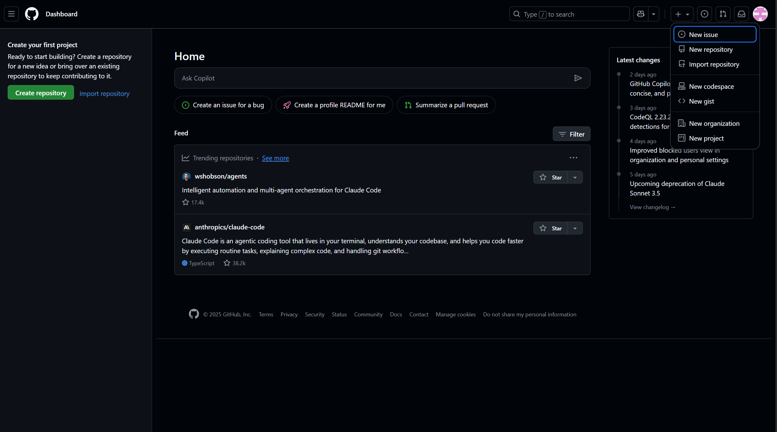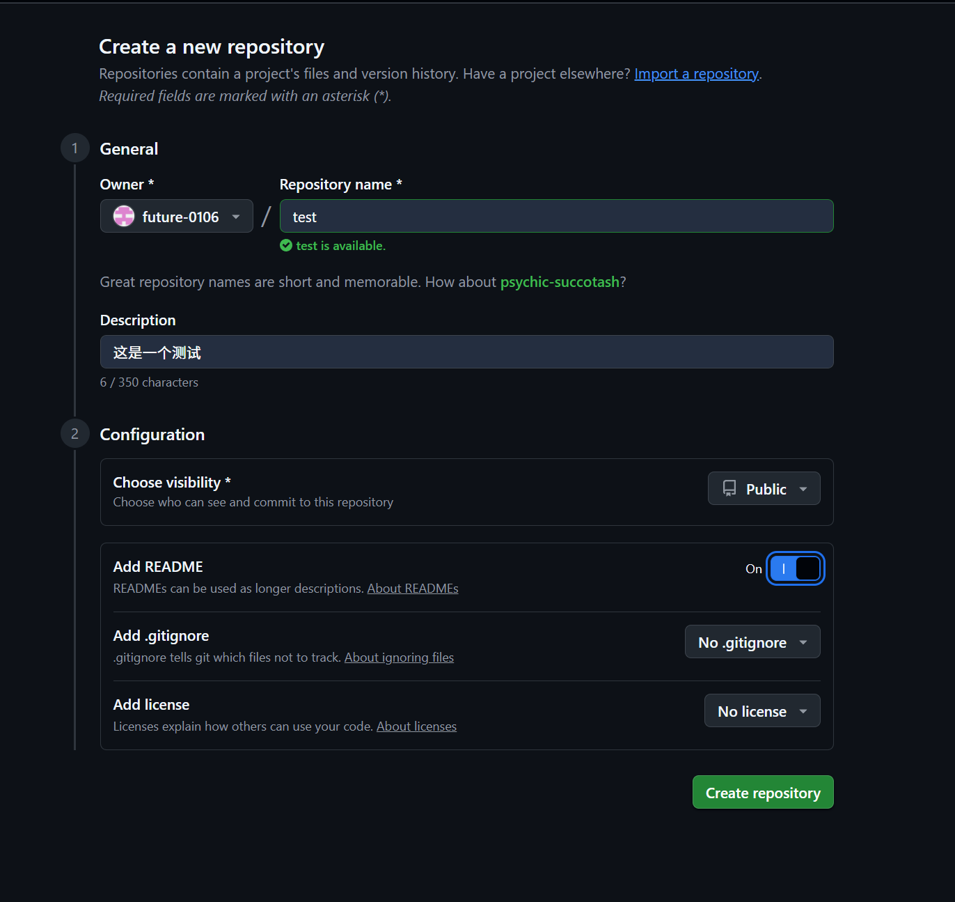 进如后,点击右上角“+”-->New repository。进入到创建仓库的界面。如图: