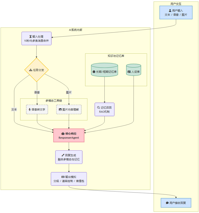 回复生成 ResponserAgent将所有信息——用户输入内容、召回的记忆、角色人设——整合在一起,交由大语言模型(LLM)生成最终回复。模型甚至会判断当前情境是否需要搭配表情包来增强情绪表达。