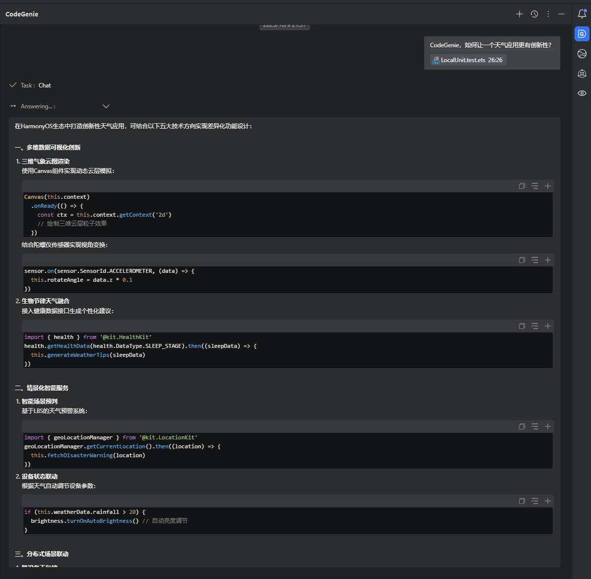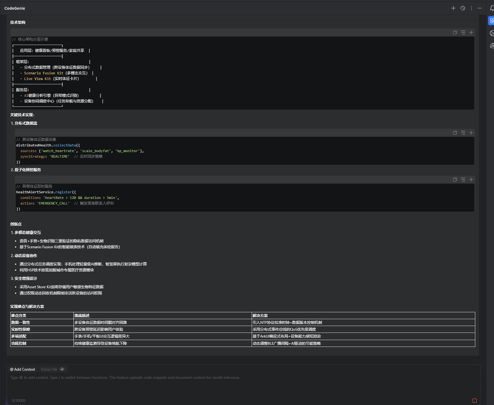 CodeGenie:提供了完整的算法逻辑和判断规则,还告诉我如何接入HarmonyOS的AI能力。