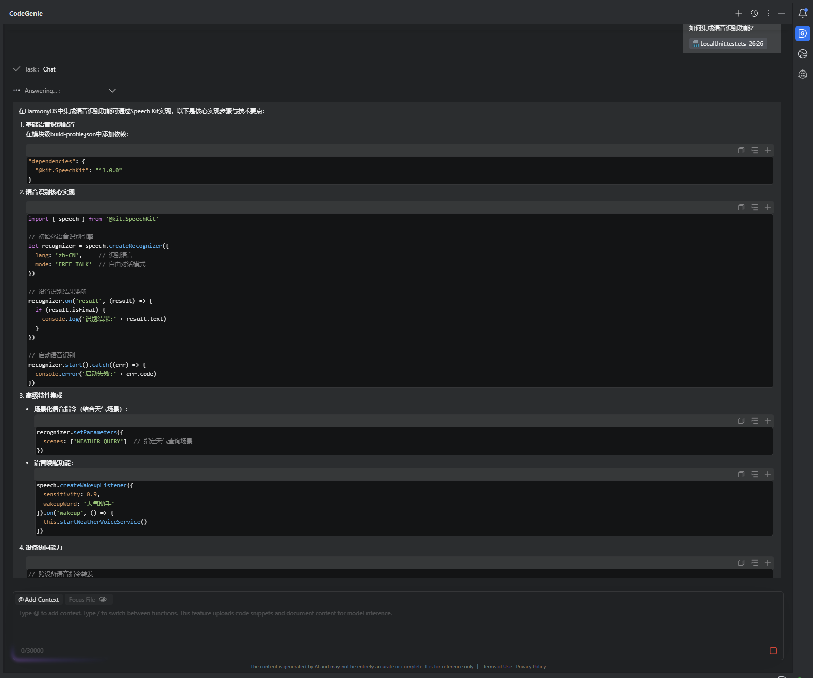 CodeGenie:提供了调用HarmonyOS语音服务的完整代码,包括权限申请、语音识别、语义理解。