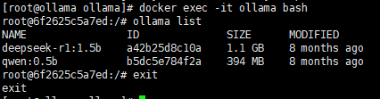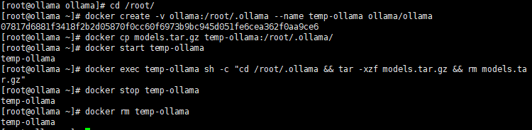 [root@ollama ~]# docker exec temp-ollama sh -c "cd /root/.ollama && tar -xzf models.tar.gz && rm models.tar.gz"