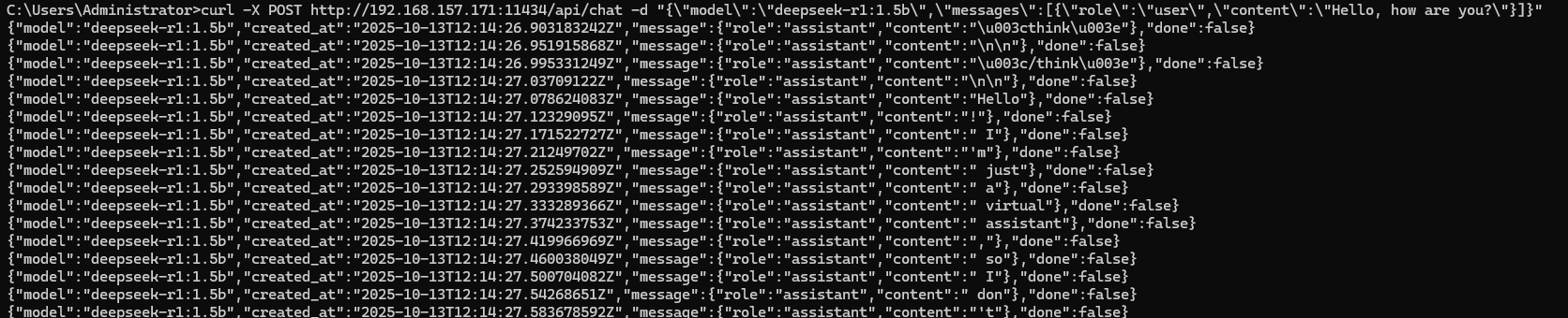 C:\Users\Administrator>curl -X POST http://192.168.157.171(虚拟机IP):11434/api/chat -d "{\"model\":\"deepseek-r1:1.5b\",\"messages\":[{\"role\":\"user\",\"content\":\"Hello, how are you?\"}]}"