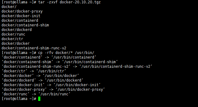 开始安装Docker服务,先解压 Docker 二进制文件包,并且把解压得到的可执行文件复制到/usr/bin/目录