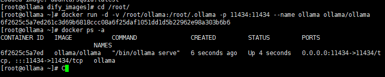 [root@ollama ~]# docker run -d -v /root/ollama:/root/.ollama -p 11434:11434 --name ollama ollama/ollama