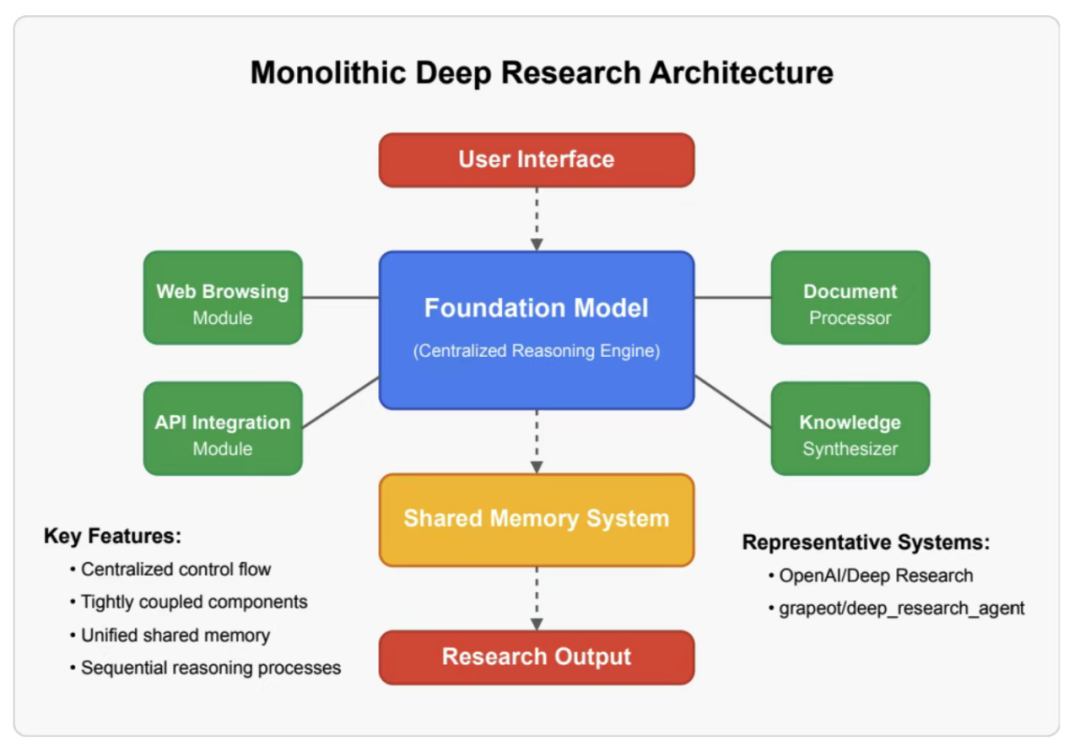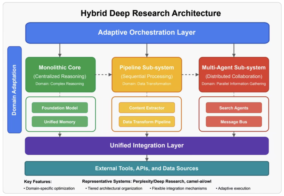 论文《A Comprehensive Survey of Deep Research: Systems, Methodologies, and Applications》梳理了OpenAI、Google、Microsoft、Meta、Anthropic 等主流科技公司对 DeepResearch 系统的技术构想与实践路径。本章节将基于该论文,介绍DeepResearch的核心维度和流行架构: