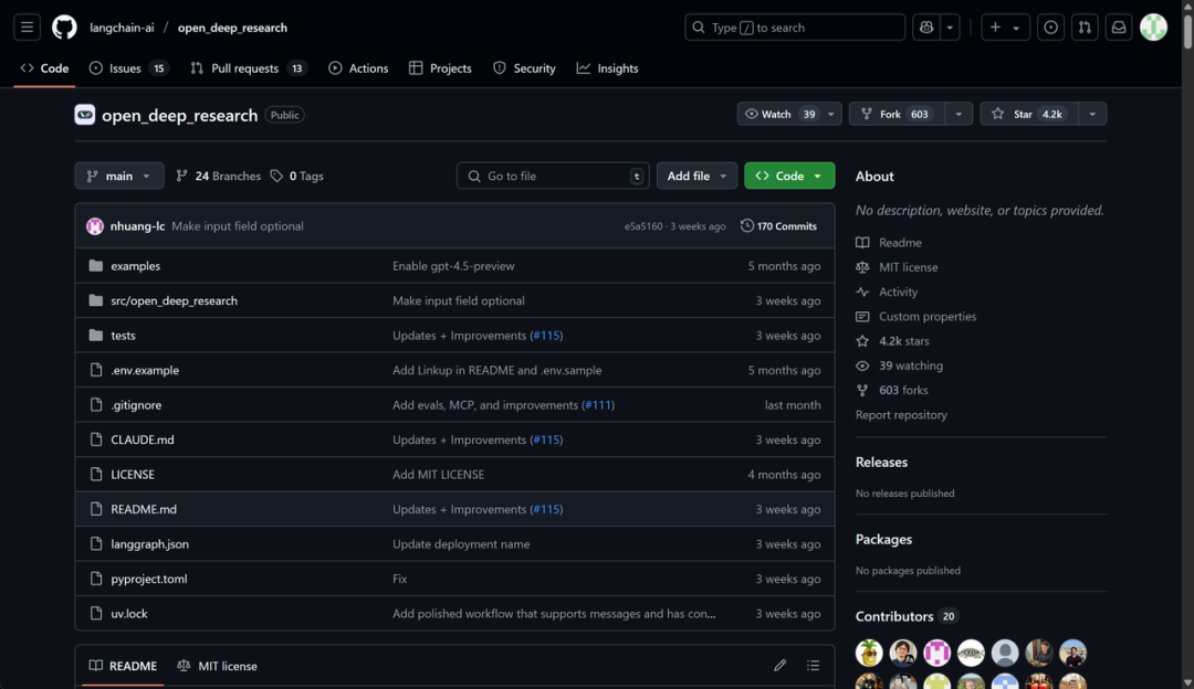 用户只需输入一个研究主题或问题,该智能体便会自动生成搜索查询,抓取并总结网页内容,识别知识盲区并持续补充检索,最终输出结构清晰的 Markdown 研究报告。其开源地址为:https://github.com/langchain-ai/open_deep_research