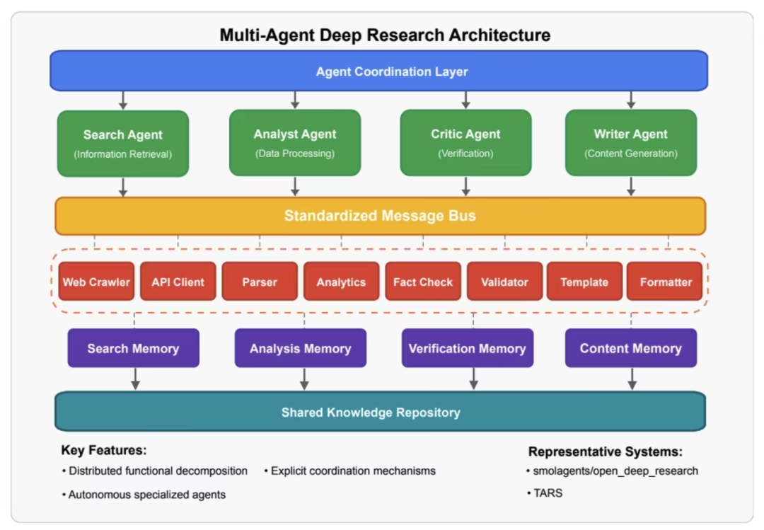 一种交互式架构,所有智能体之间都可以直接交互,不同智能体的输出由评价模型进行验证和比较,通过多智能体间的协作提升研究深度。代表性产品包括:Anthropic Team-Agent 原型