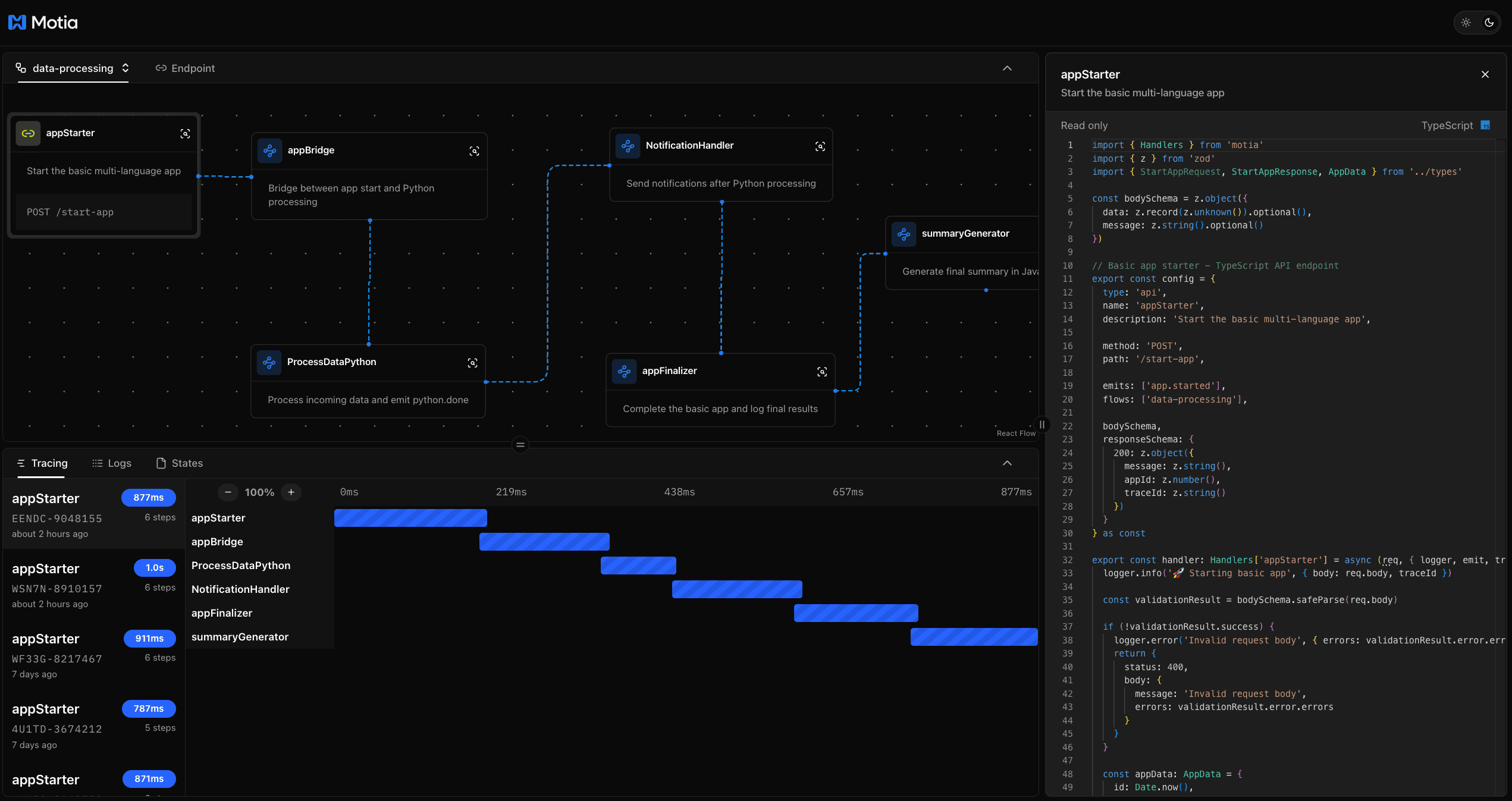 这是一款一站式后端后框架,集成了 API、事件驱动、定时任务、实时数据流和 AI Agent 等能力,支持 TypeScript、Python 等多语言混合开发。它内置状态管理、结构化日志、端到端链路追踪与可视化调试器(Workbench),支持流程图、日志流和实时测试等功能。