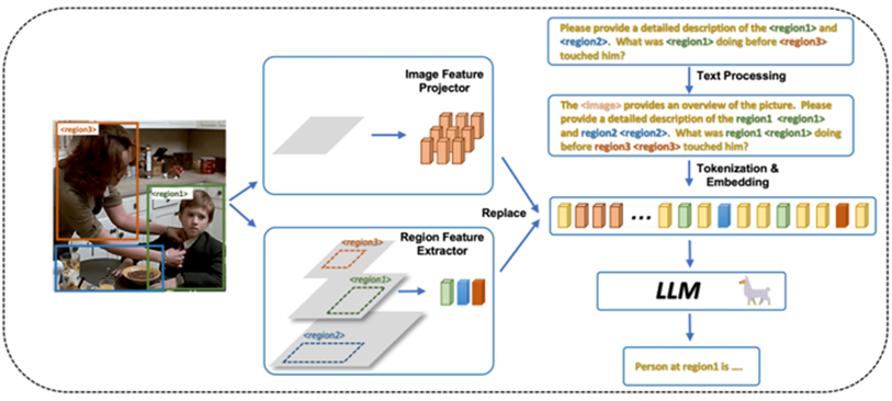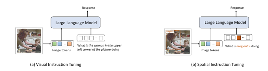 提出空间指令微调 (Spatial Instruction Tuning):将用户指令中的 区域引用 (bounding box reference) 转换为 区域特征 (RoI features),并与语言嵌入交替输入到 LLM,实现了对图像的细粒度区域级理解。