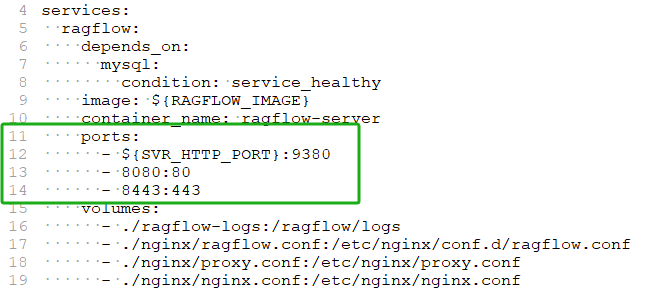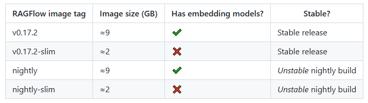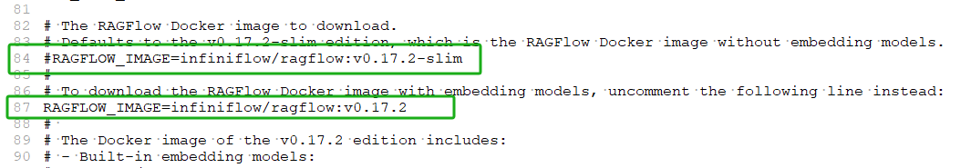 由于默认RAGFlow镜像为v0.17.2-slim,我们需要带Embedding model的完整发行版,需要修改docker/.env文件内的 RAGFLOW_IMAGE 变量,如图第84行和87行变量。