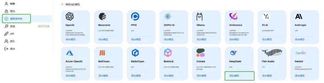点击“System Model Settings”配置默认模型,包括Chat model、Embedding model、Image-to-text model。Embedding model可以选择内置的BAAI模型,也可根据需要自定义配置。