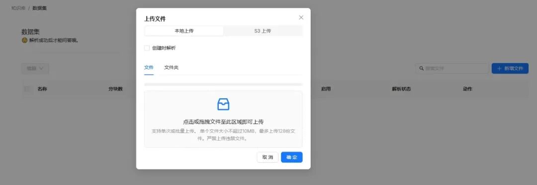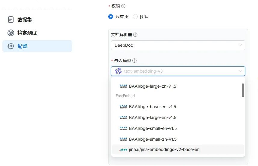 注意:当选定embedding model并用于解析文档后,该知识库就不再支持修改该参数。