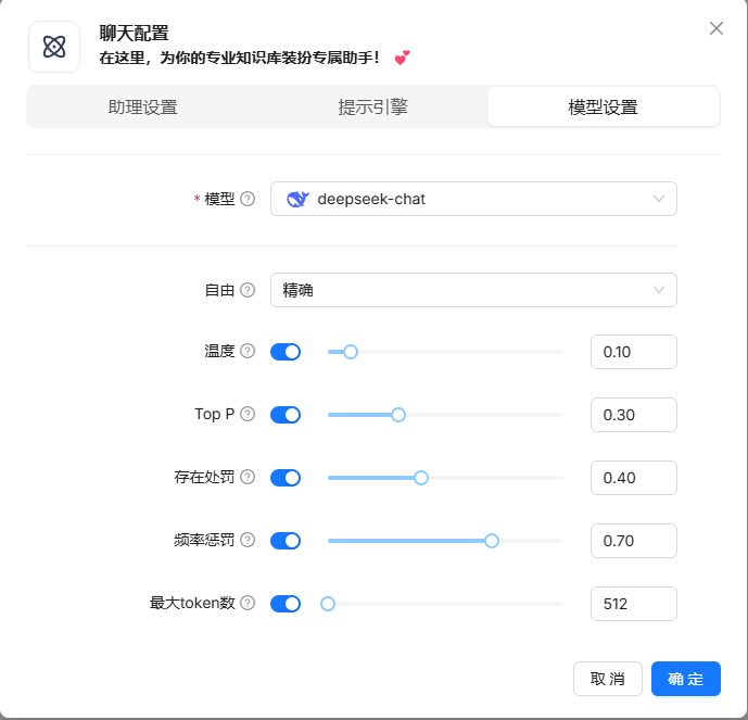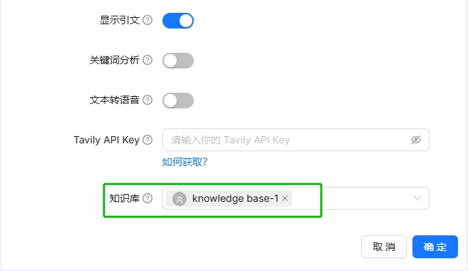 在“聊天” → “创建助手”中创建对话服务,“助理设置”中配置需要引用的知识库:
