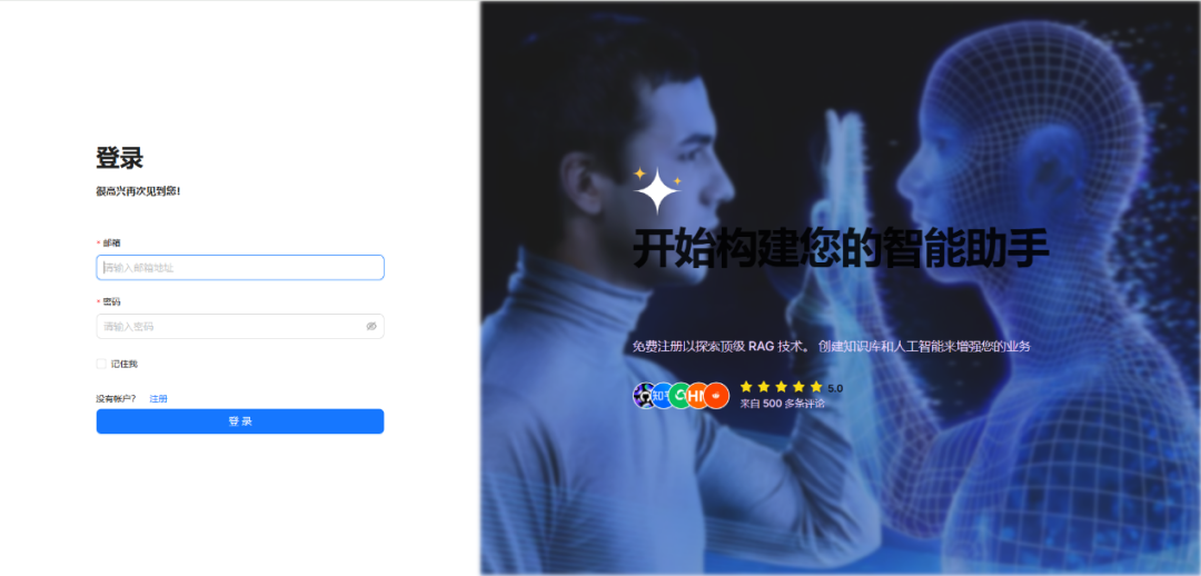 浏览器访问安装服务器地址即可访问RAGFlow服务(未改动过配置则无需输入端口,默认的 HTTP 服务端口 80)。