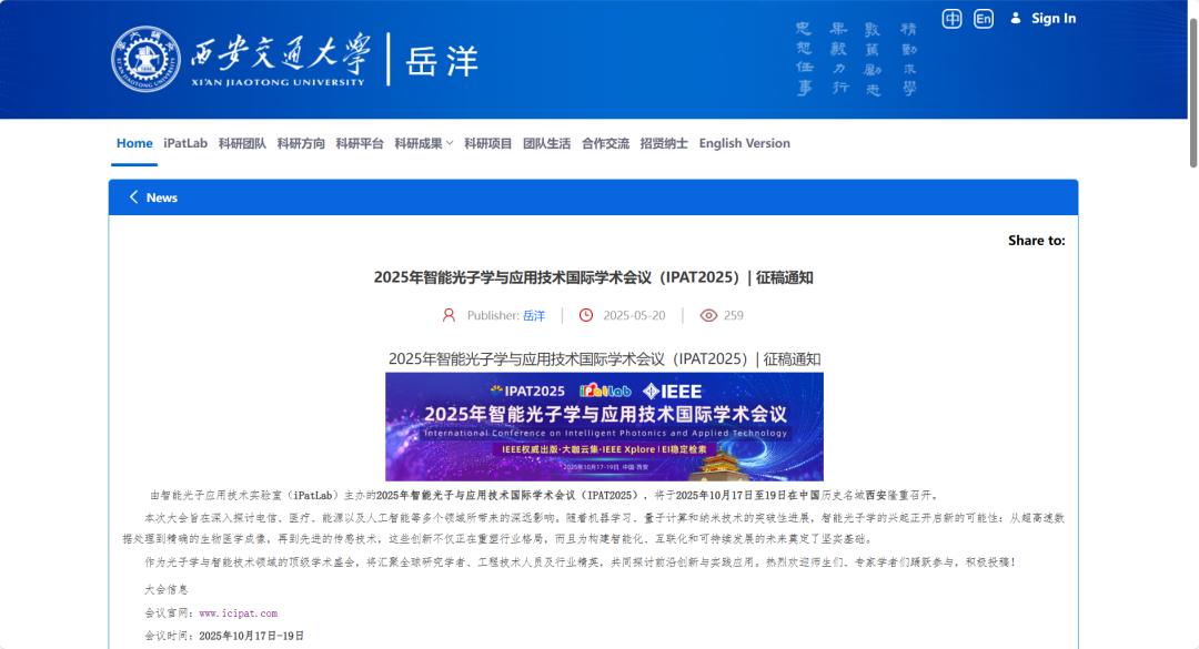 2025年智能光子与应用技术国际学术会议(IPAT 2025)将由西安交通大学的智能光子应用技术实验室(iPatLab)主办,于2025年10月17日至19日在中国·西安隆重召开。作为光子学与智能技术领域的顶级学术盛会,本次会议将汇聚全球研究学者、工程技术人员及行业精英,共同探讨前沿创新与实践应用。
