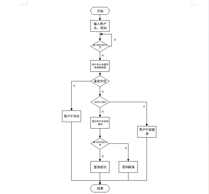 用户输入用户名和密码后,系统先检查输入是否为空,再验证用户名是否存在,若存在则通过用户名获取密码并校验。若密码正确则登录成功,否则提示密码错误。若用户名不存在或无法登录,提示用户操作无效。如图3-4所示。