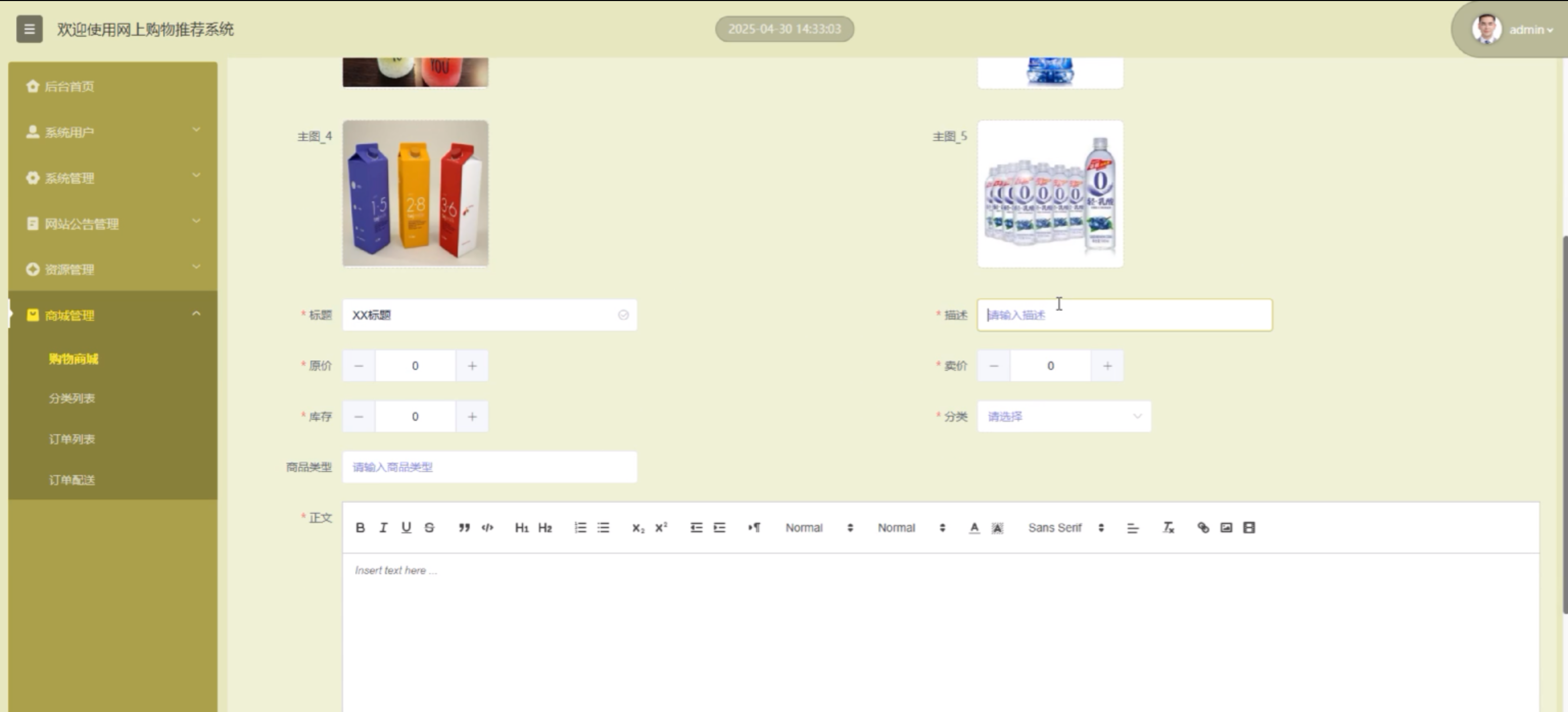 商城管理:商城管理包含多个功能模块,如购物商城、分类列表、订单列表、订单配送。点击进入“分类列表”可添加商品分类信息;点击进入“订单列表”可查看用户下单信息,同时点击“配送”按钮进行商品配送;点击进入“订单配送”可对配送状态和签收状态进行修改。点击进入”购物商场“可添加新的商品信息,包括封面图、主图、标题、描述、原价、卖价、库存、分类、商品类型和正文。界面如下图所示。