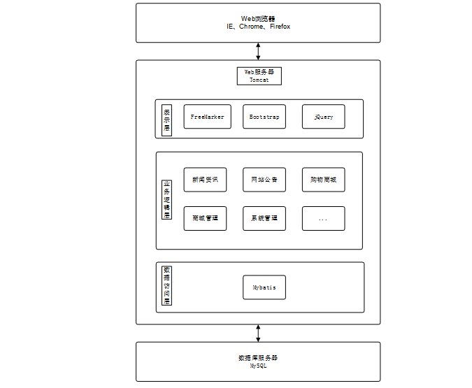 系统由表现层、业务逻辑层、数据访问层和数据库服务器组成。表现层通过浏览器(如IE、Chrome、Firefox)与用户交互,采用FreeMarker、Bootstrap、jQuery等技术实现界面呈现。业务逻辑层负责处理系统的核心业务逻辑,通过分模块设计实现功能分离。数据访问层使用MyBatis框架连接数据库,执行数据的增删改查操作。数据库服务器采用MySQL进行数据存储和管理,为系统提供稳定的数据库支持。整个架构通过Tomcat服务器完成用户请求的接收和处理,确保系统的高效运行[8]。整个系统架构如图4-1所示。