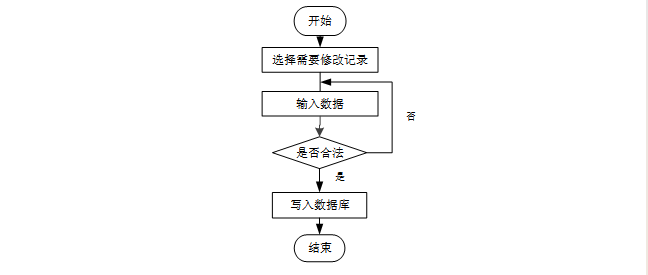 用户首先选择需要修改的记录,输入修改后的数据,系统判断输入数据是否合法。若数据不合法,提示重新输入;若数据合法,则将修改后的数据写入数据库,完成操作后流程结束。修改信息流程图如图3-7所示。