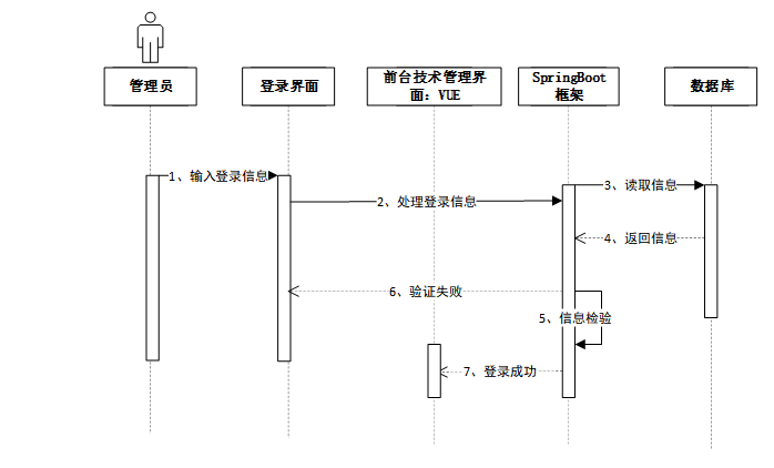 管理员输入登录信息后,登录界面将信息传递至前台管理界面,随后通过SpringBoot框架读取数据库中的用户信息并返回。系统验证信息,若验证成功则登录成功,若验证失败则返回错误提示。登录时序图如图4-4所示。