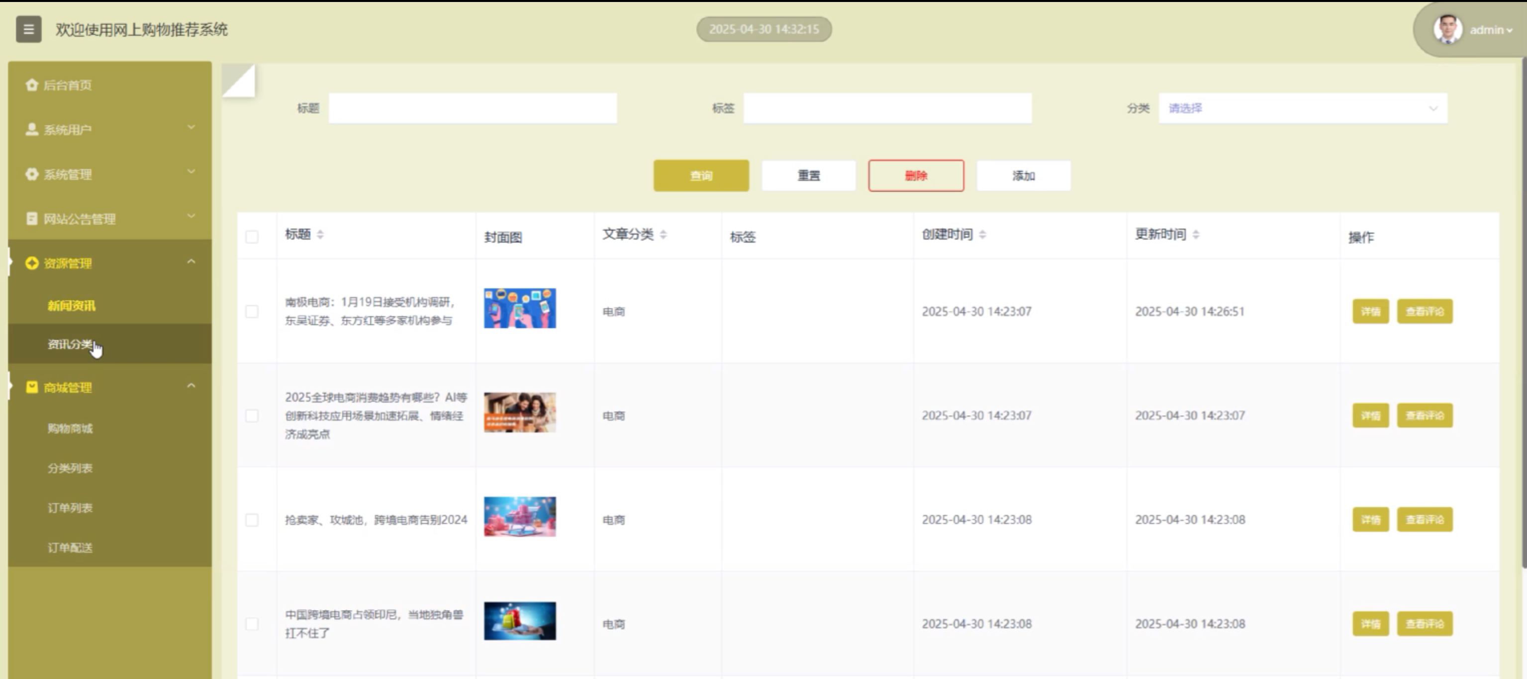 资源管理:管理员点击可查看新闻资讯和资讯分类;如需添加新的资讯,点击“添加”按钮,上传封面图,输入标题,选择分类,输入标签、描述和正文,点击“确认”按钮进行添加。同时可对资讯和分类进行增删改查。界面如下图所示。