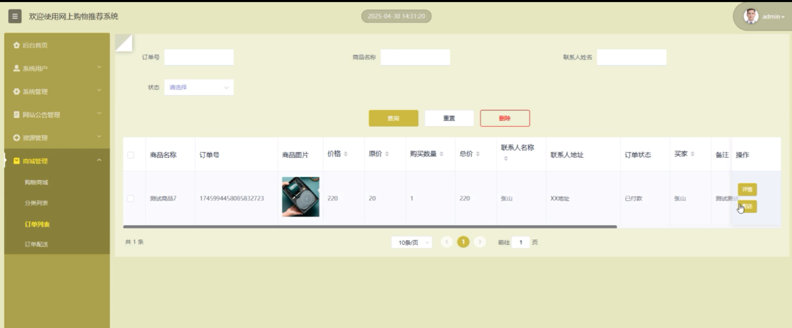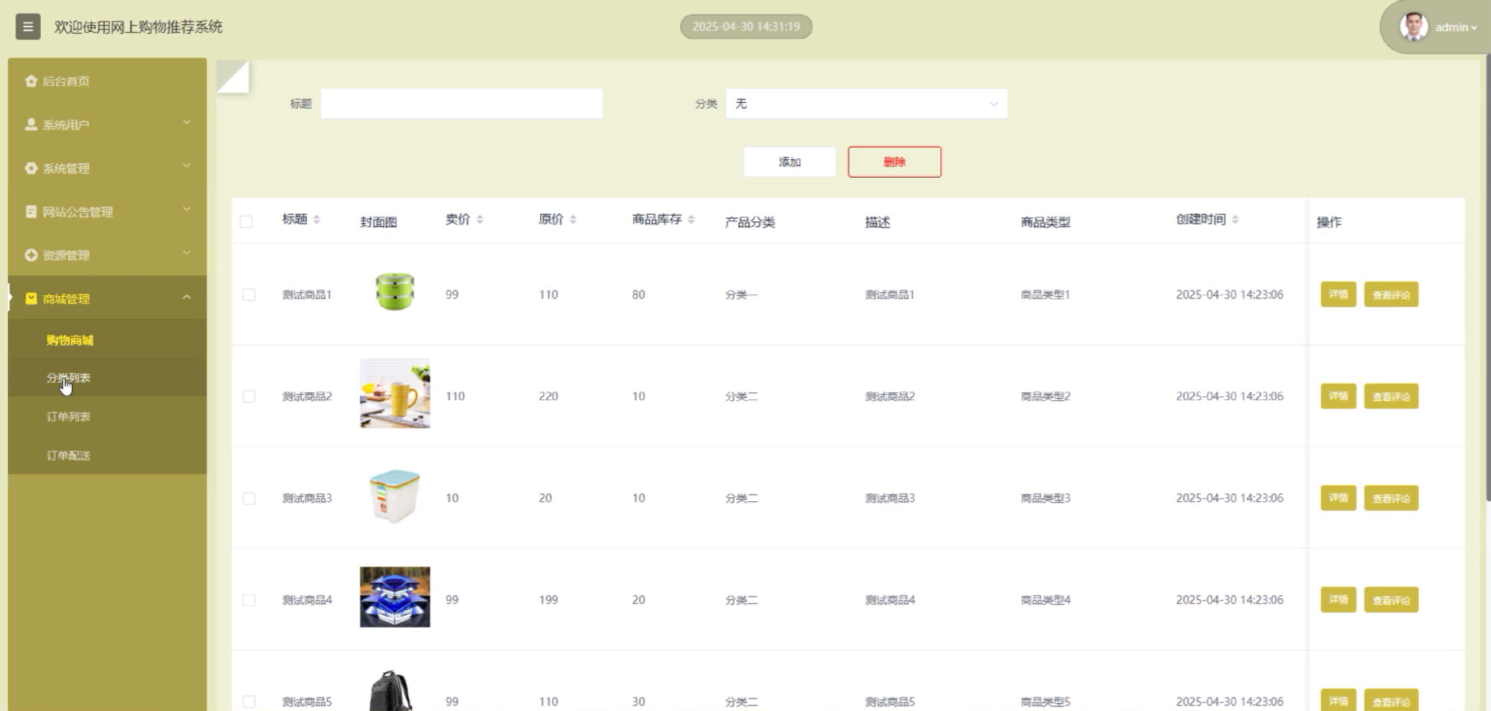 (7)商城管理:商城管理包含多个功能模块,如购物商城、分类列表、订单列表、订单配送。点击进入“分类列表”可添加商品分类信息;点击进入“订单列表”可查看用户下单信息,同时点击“配送”按钮进行商品配送;点击进入“订单配送”可对配送状态和签收状态进行修改。点击进入”购物商场“可添加新的商品信息,包括封面图、主图、标题、描述、原价、卖价、库存、分类、商品类型和正文。