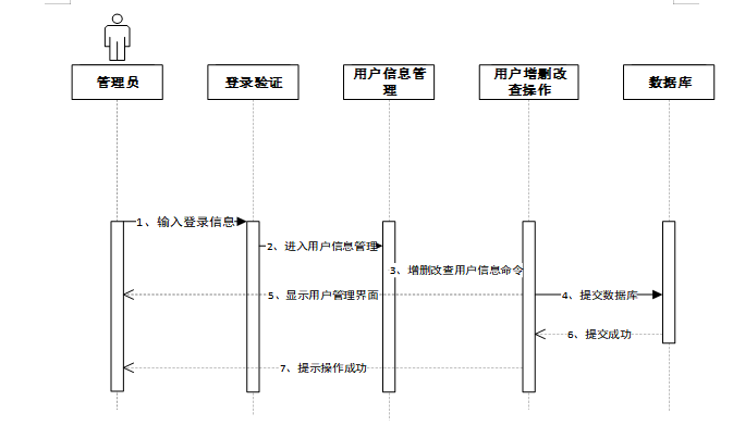 管理员输入登录信息后,进入用户信息管理模块,选择增删改查操作并提交命令至数据库。数据库执行操作后返回成功状态,系统显示用户管理界面并提示操作成功。管理员修改用户信息时序图如图4-5所示。