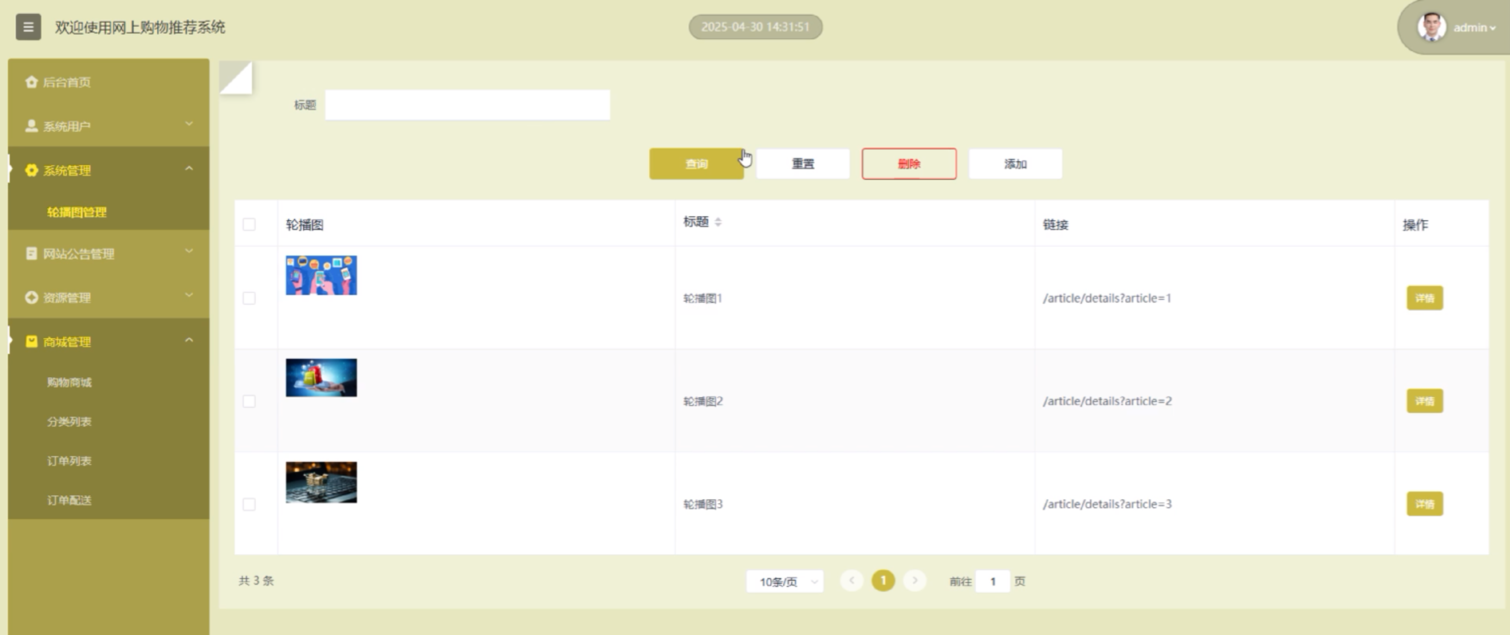 (4)系统管理:管理员点击可查看轮播图管理;如需添加新的轮播图,点击右侧“添加”按钮,上传图片,输入标题和链接,点击“确认”按钮进行添加,可对轮播图进行增删改查。