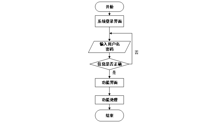 用户首先进入系统登录界面,输入用户名和密码后,系统验证信息是否正确。若验证失败,返回登录界面重新输入;若验证成功,则进入功能界面,执行相应功能处理后结束操作流程。操作流程如图3-5所示。