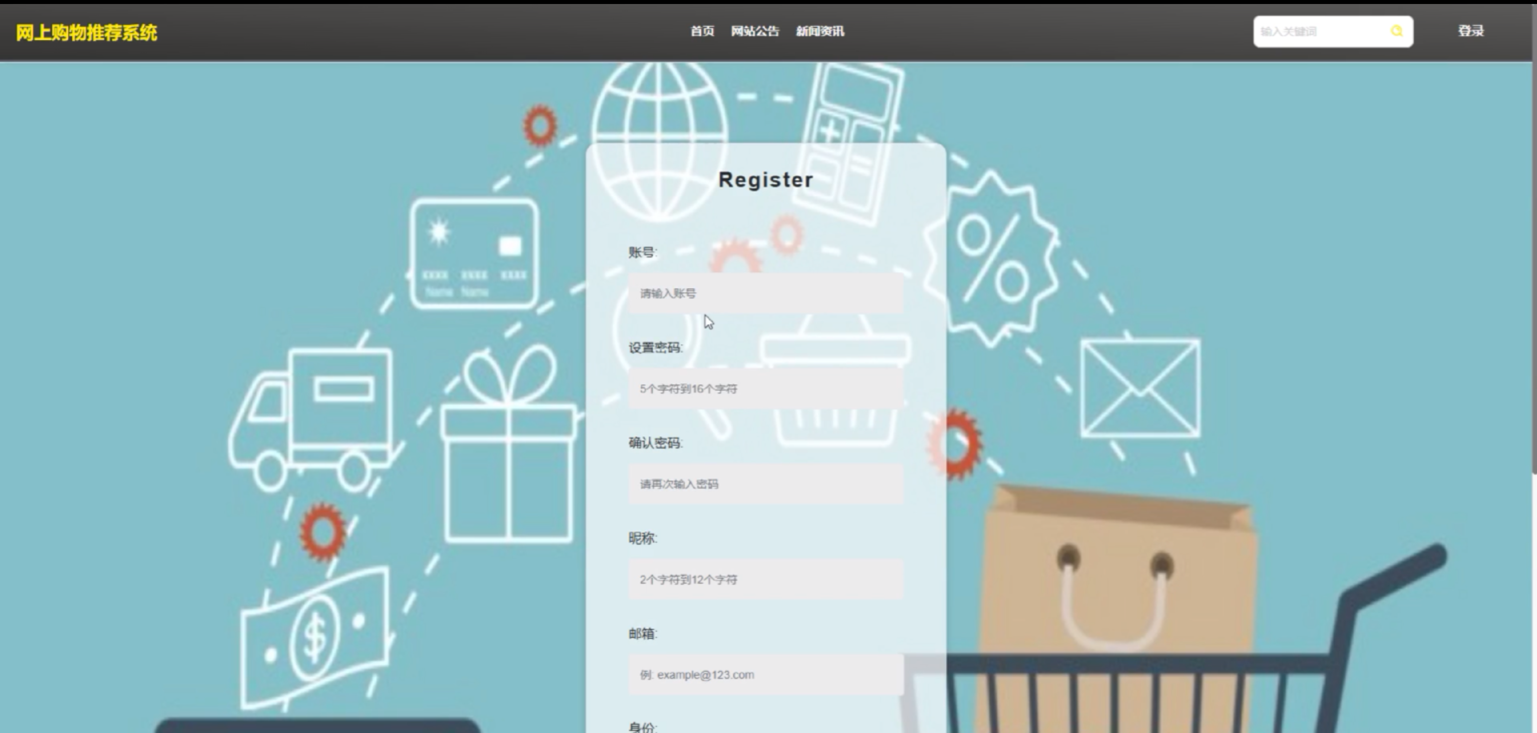 (1)注册登录:在网上购物推荐系统中,用户可通过简洁的界面完成注册与登录操作。注册时,用户填写基本信息并提交即可创建账户;登录时,输入用户名和密码后即可快速进入平台,享受便捷的晚上购物服务。