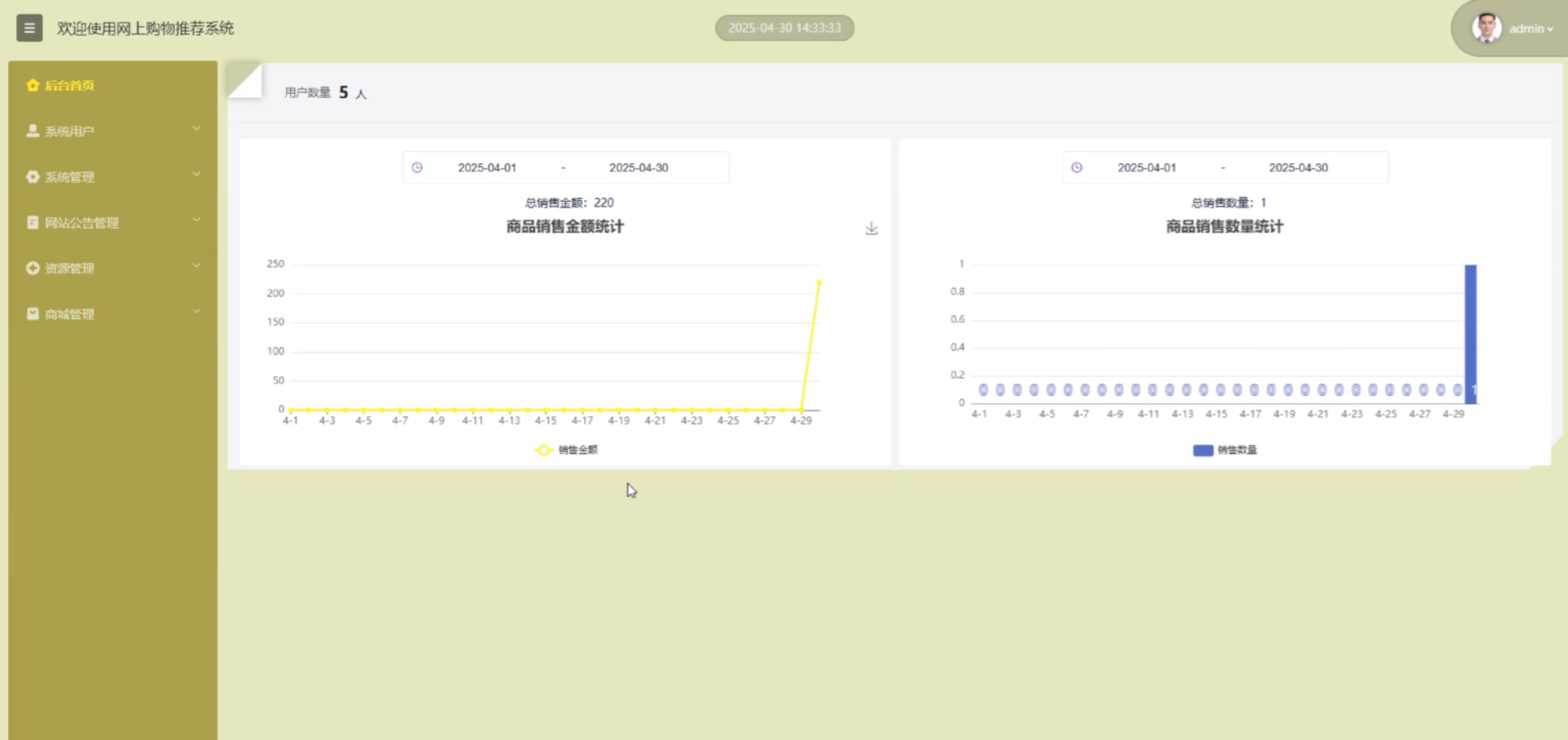 (2)后台首页:在后台首页功能中,管理员可以查看平台的整体运营情况,包括用户数据、订单信息、商品销售情况等关键指标。通过简洁的数据统计图,管理员能够实时监控平台的运行状态,快速识别潜在问题并进行调整。此外,后台首页还提供了快捷访问各项管理功能的入口,提升了管理效率。