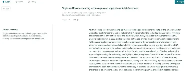 用户可以上传自己的 PDF 文件,Elicit 会提供快速摘要和每个答案的来源。