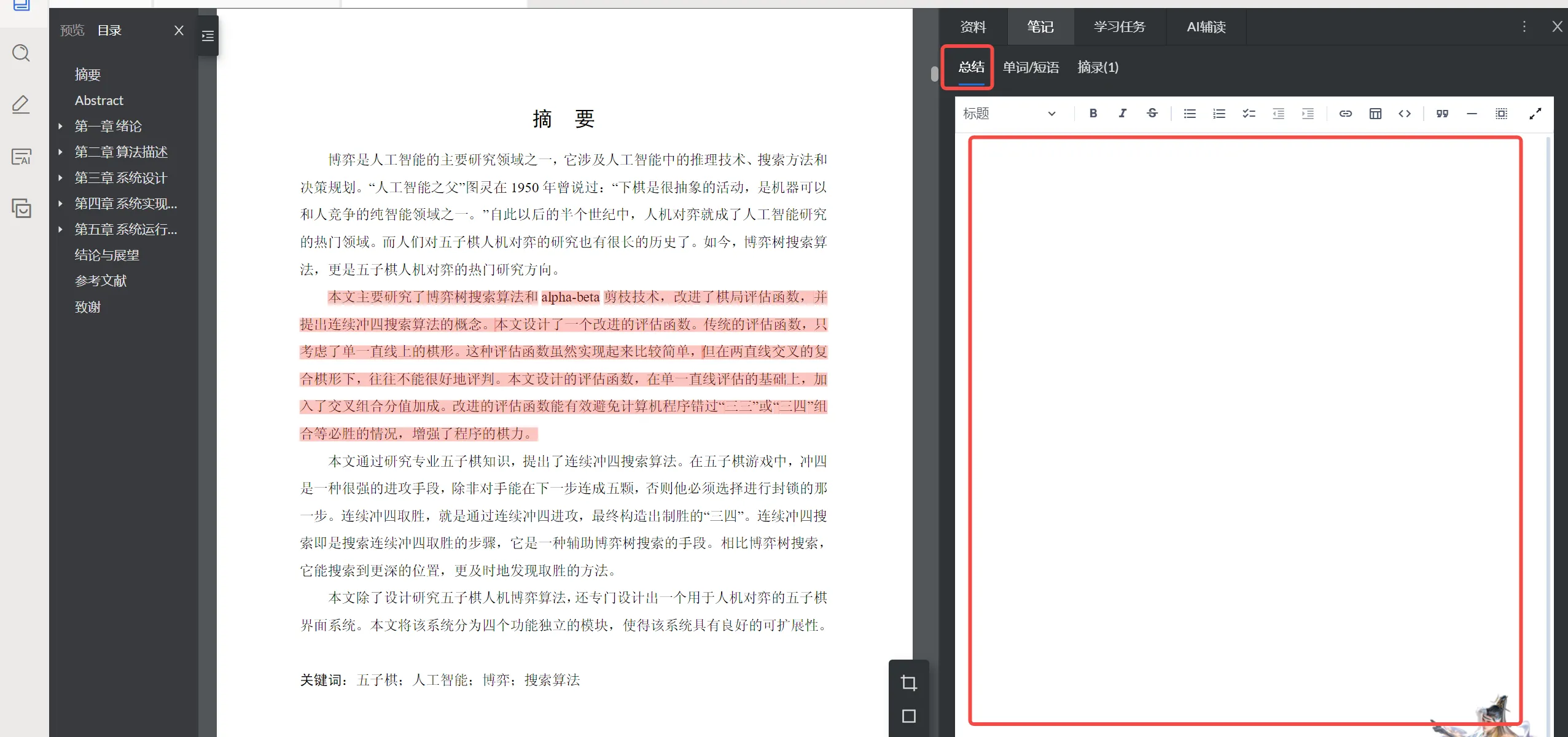 总结是用户自我撰写的总结文件,页面与Word基本一致,可以复制源文件中的语言加入到总结中,并加入外部链接、代码块等辅助。