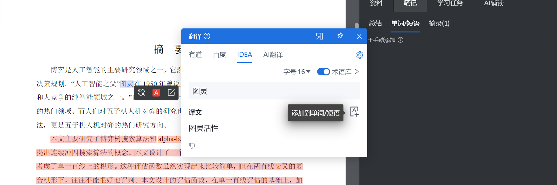 支持手动添加/在翻译页面的生成结果中添加到短语(或摘要中)。可选有道、百度、IDEA和AI翻译四种,并可以自己添加阿里、腾讯、DeepL和Google翻译。